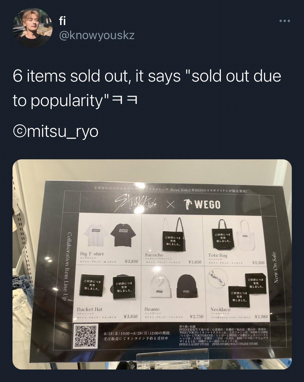 Half of the WEGO x Stray Kids items on Harajuku’s already sold out and it’s only 12:40 JST. Wow
