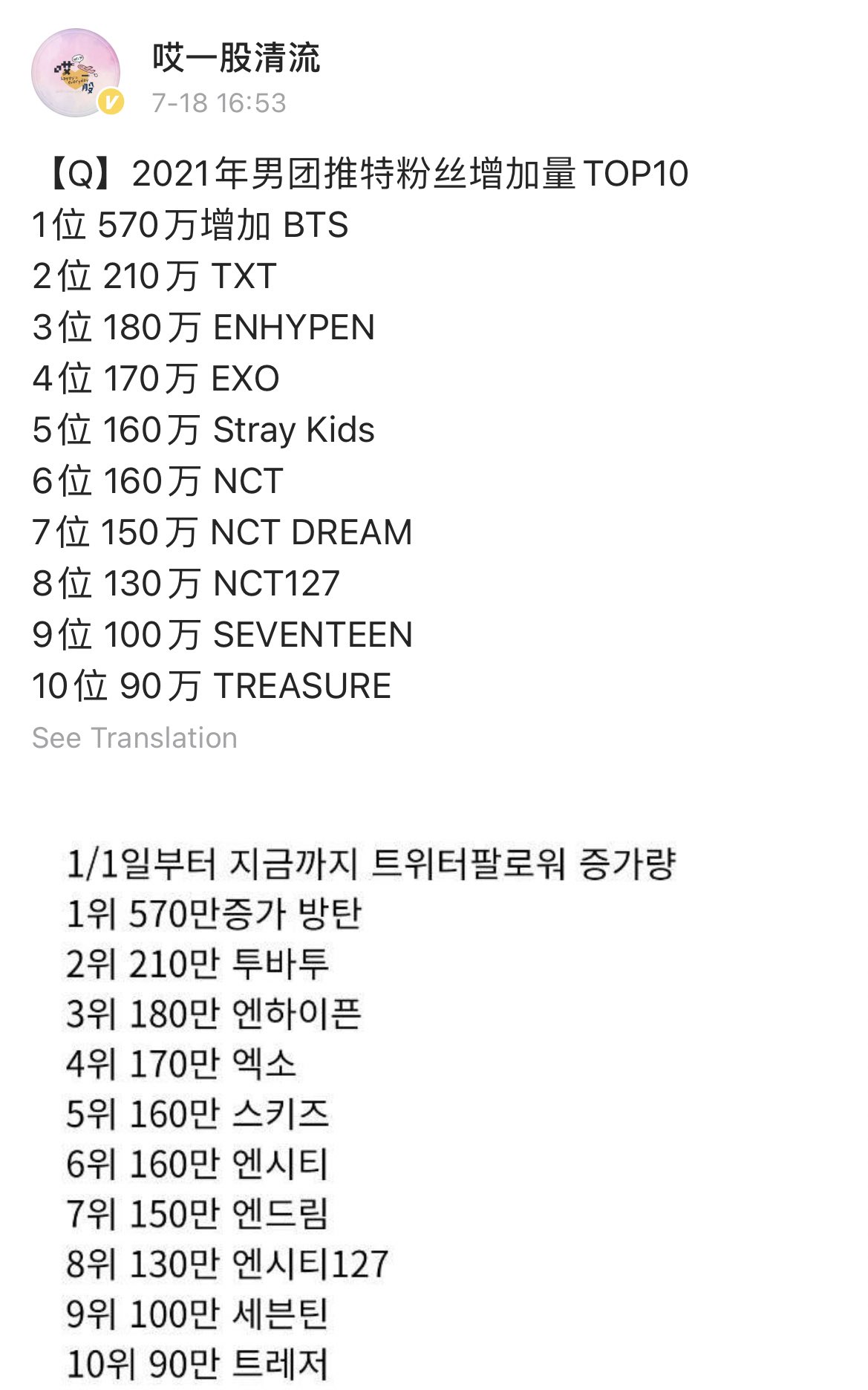 According to a summary post on theqoo, SKZ is ranked 3rd for the largest growth (+1.66M subs) on youtube and the 5th largest growth on twitter (+1.6M subs) for the first half of 2021