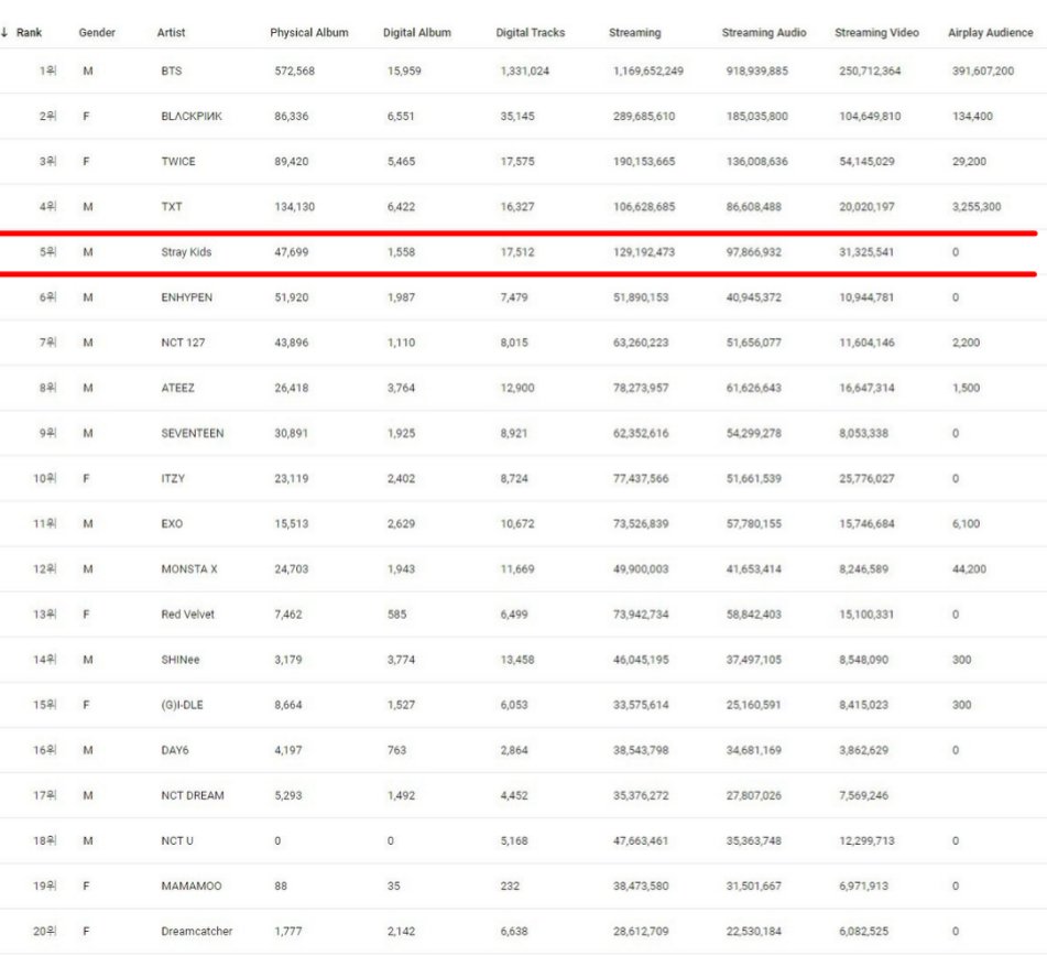 SKZ is ranked #5 without a comeback.
