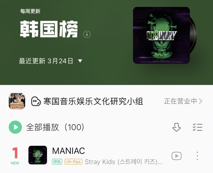 "MANIAC" debuted at #1 on 🇨🇳 QQ Music Weekly Kpop Chart! It is their first song to do so.@Stray_Kids #StrayKids #스트레이키즈pic.twitter.com/ZmHkBBm2OY