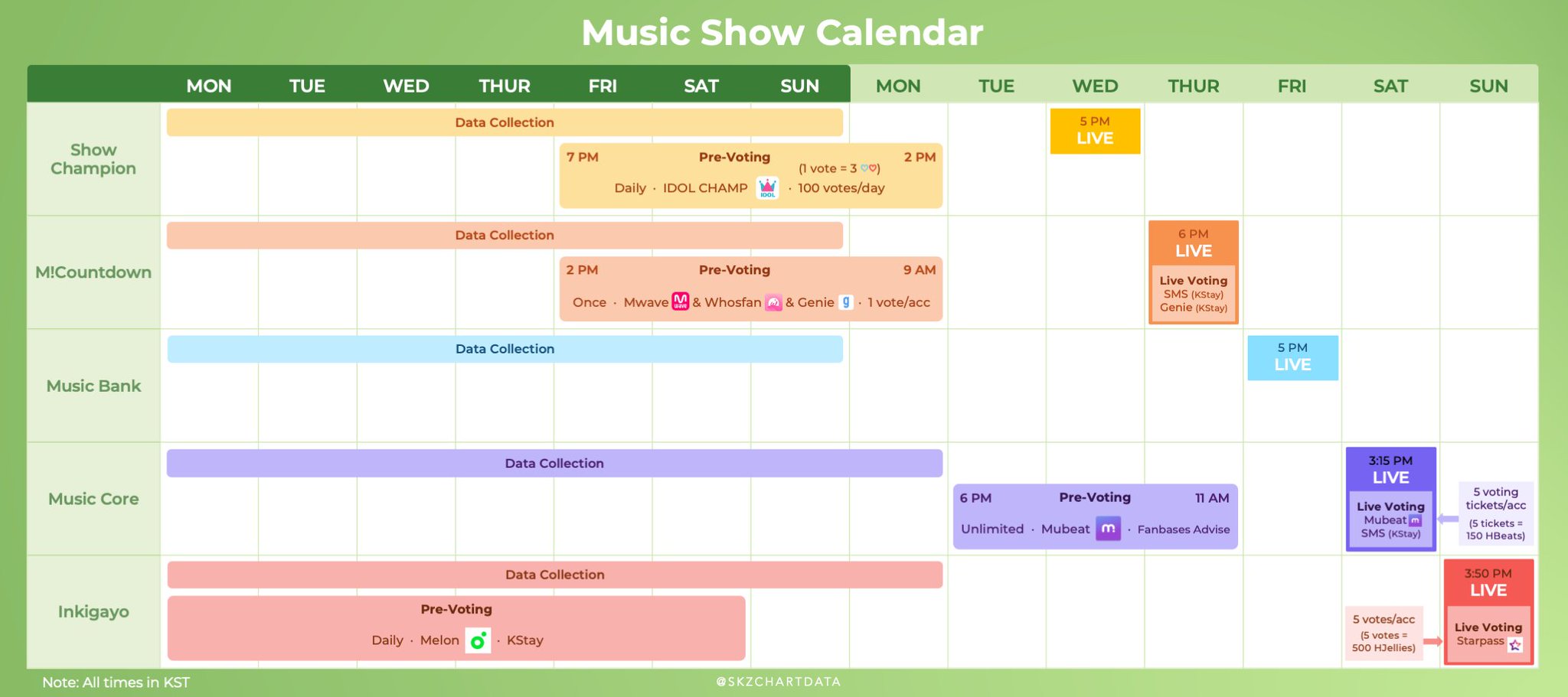 Notice: we will only have 3 days of data recording (Fri-Sun) for the 1st week. Sat and Sun will normally have data recording delay plus no shipping. So it will be harder for music show wins, but it is not impossible if our 1st day sales are high.