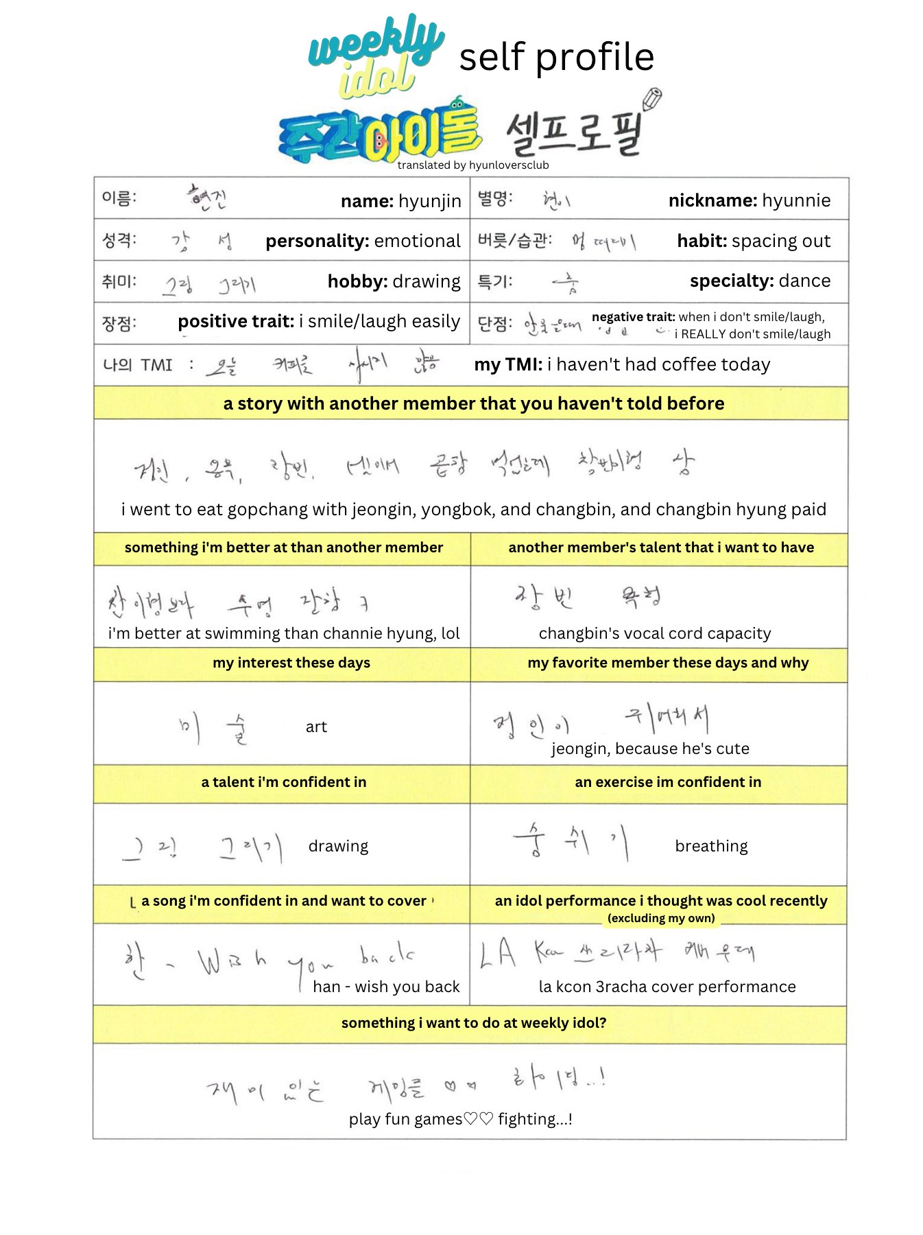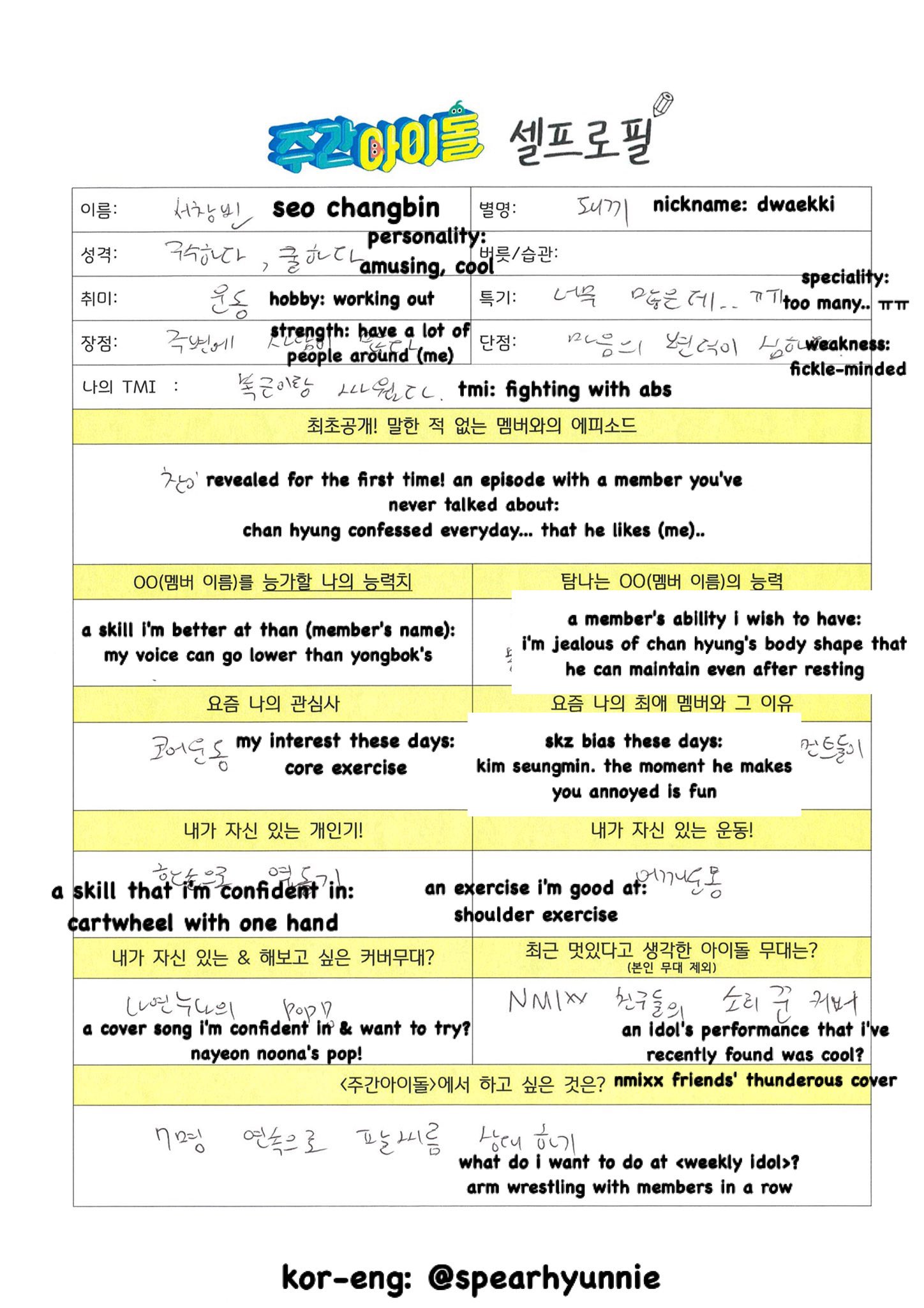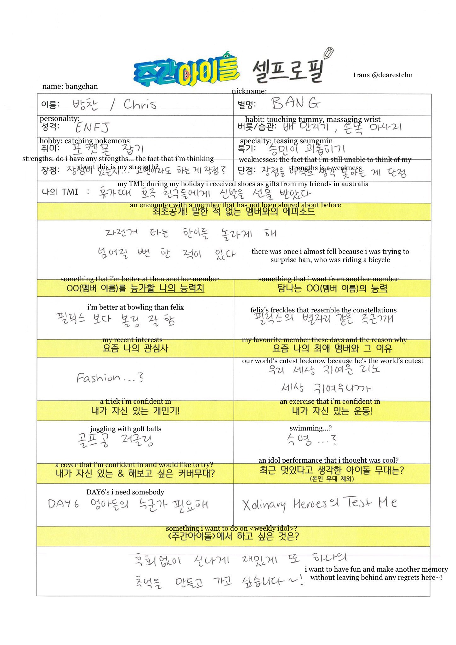 The translation so far is all bits and pieces. I only found Changbin in full. Will update this post when I found full translation#주간아 #주간아이돌 @weeklyidol_ #StrayKids #스트레이키즈 @Stray_Kids