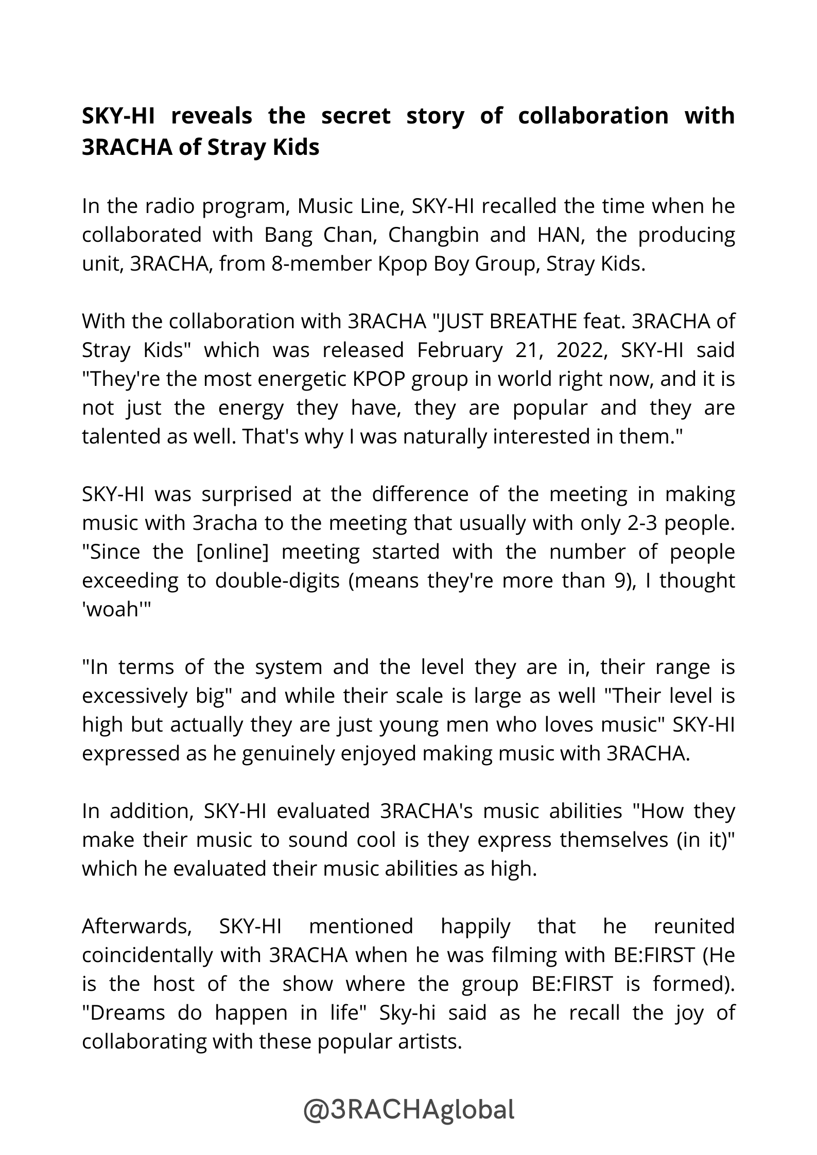 SKY-HI reveals the secret story of collaboration with 3RACHA of Stray Kids